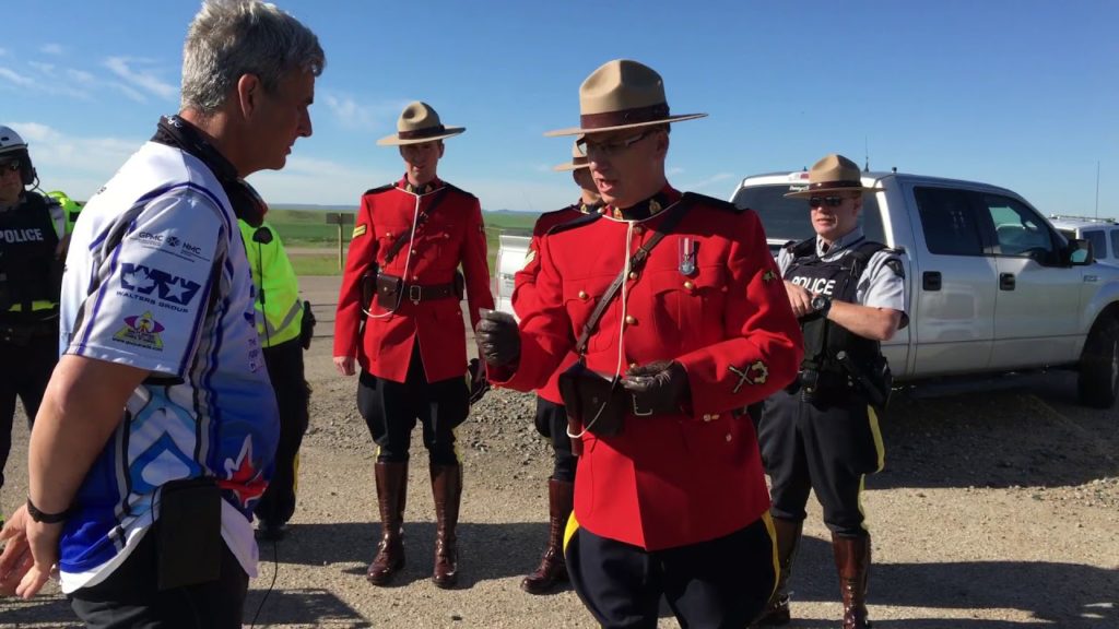 RCMP Saskatchewan members “hand-off” Joe to RCMP Alberta members to ensure Joe’s safety while he walks across their province.