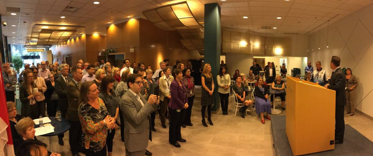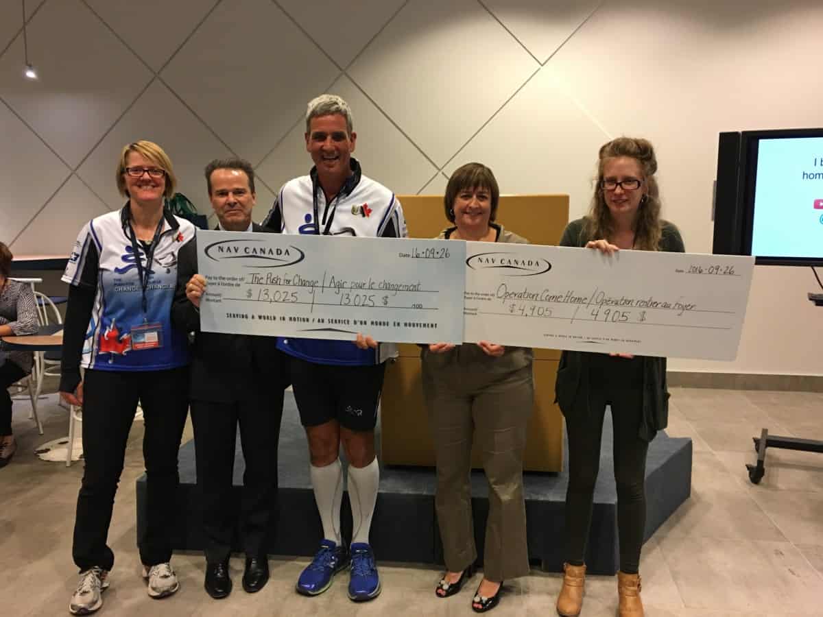 Cheque presentation & photo op from May 14 Walk, funds raised by employees $13,000 matched by Head Office. Joe shared his inspirational message with Head Office staff.